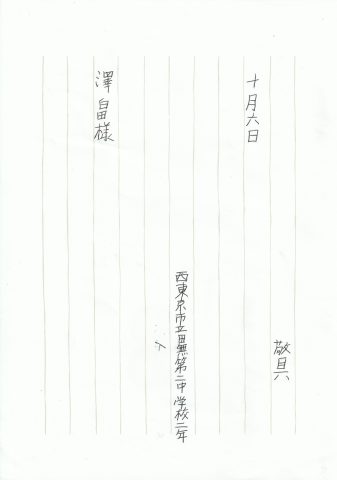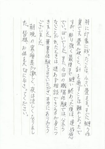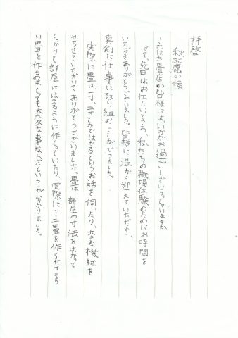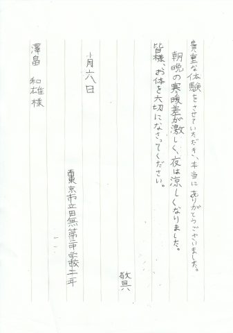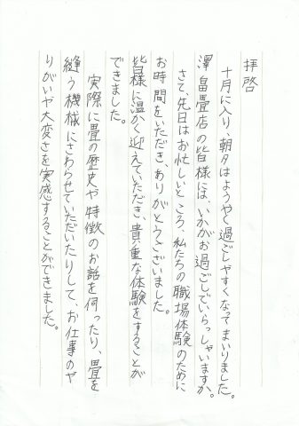 職場体験のあと、お二人から丁寧なお礼の手紙をいただきました。