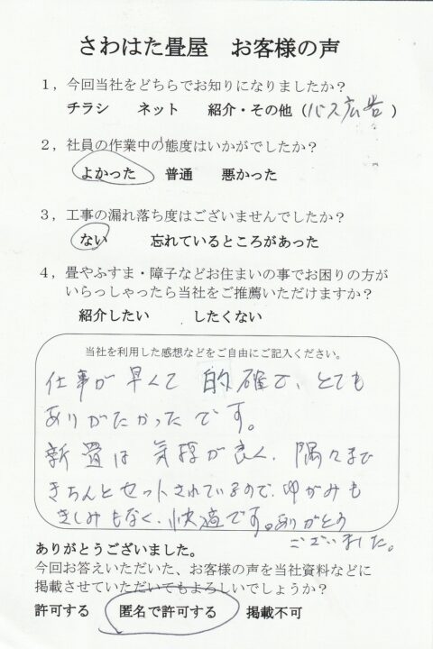 「仕事が早くて的確で、とてもありがたかったです。新畳は気持ちがよく、隅々まできちんとセットされているので、ゆがみもきしみもなく、快適です。ありがとうございました。」