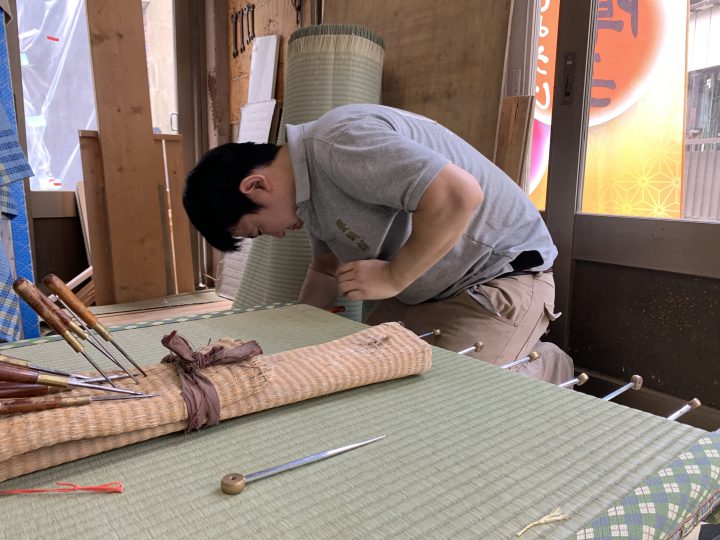 天然のイ草は、品質などを保つために泥染をしてありますので最後にひき仕上げをします。