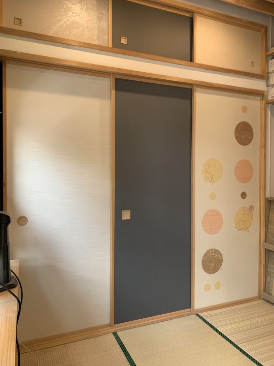 洋室側はベニヤの上にクロス貼り、または合板建材。和室側はベニヤの上にふすま紙を貼り、廻りに薄いふすま縁を貼り付けてふすまのように見せます。紙はどちらもベタ貼りします。