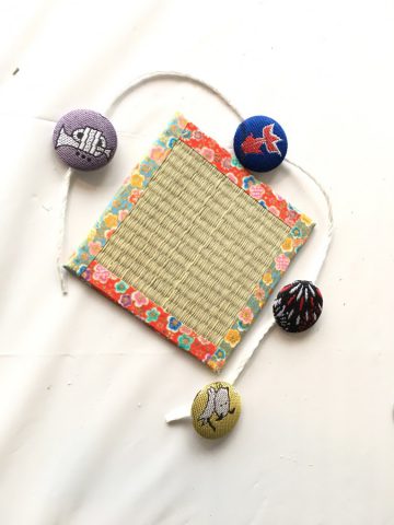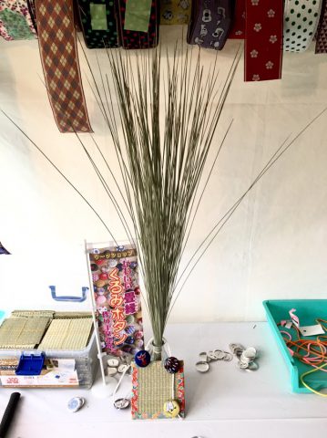 い草の原草プレゼントと子供向けのワークショップとして、クルミボタン作りとミニコースター作りを行いました。
