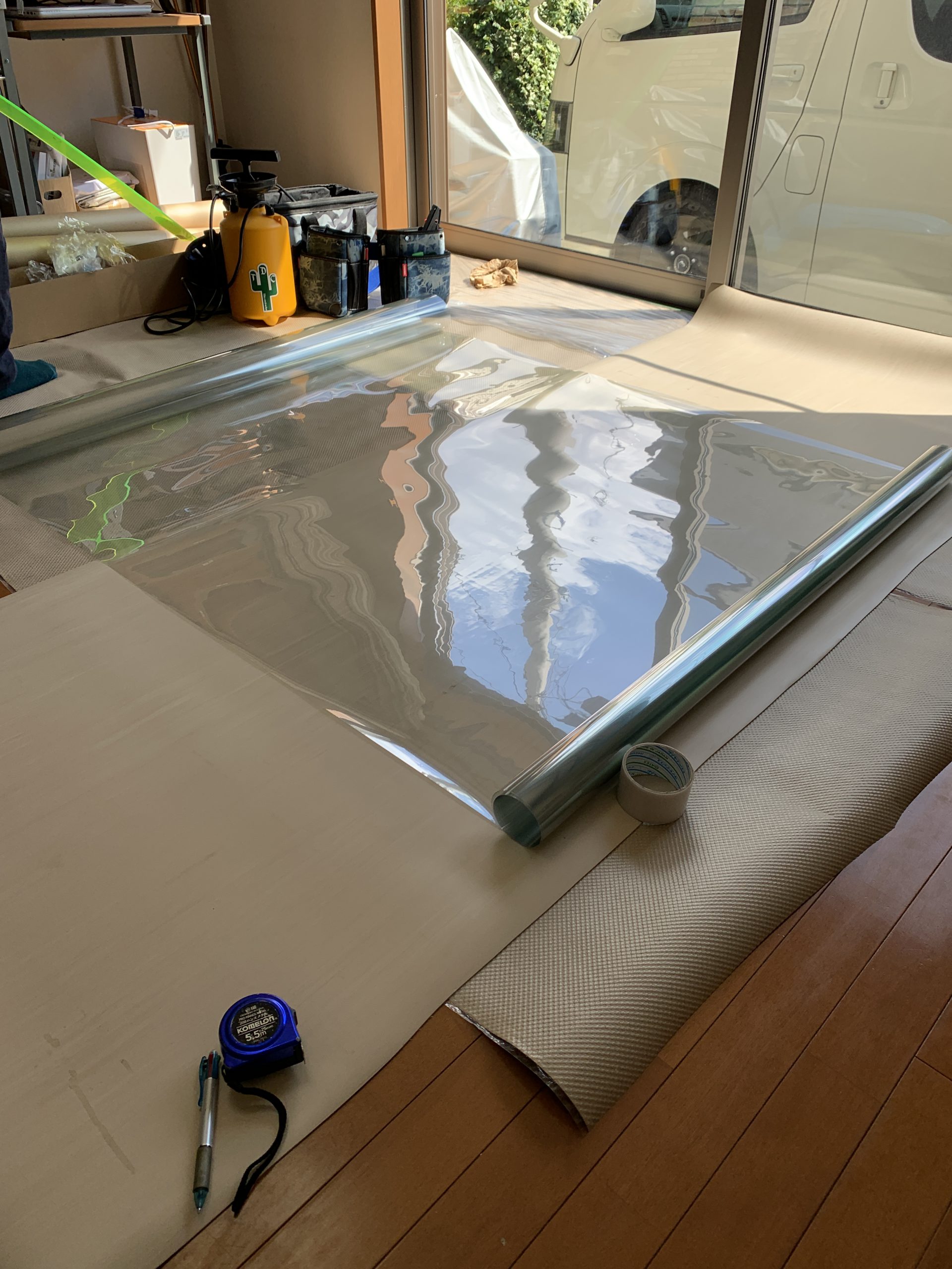 光を反射することで、窓の外の風景が少し